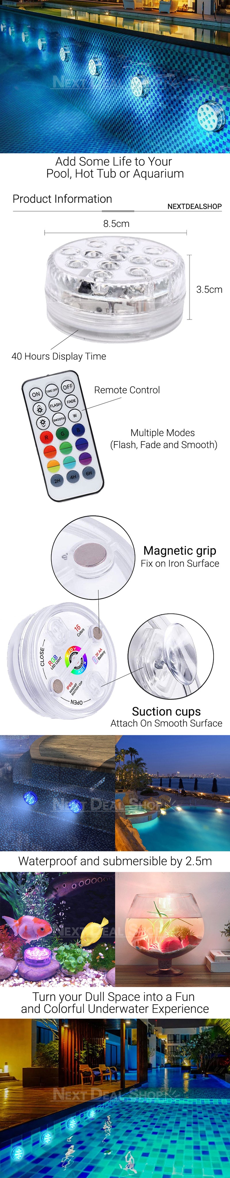 Fügen Sie Ihrem Pool, Whirlpool oder Aquarium etwas Leben hinzu mit diesen magnetischen Unterwasser-LED-Leuchten mit Saugnäpfen. Verwandeln Sie Ihren langweiligen Raum in ein lustiges und farbenfrohes Unterwassererlebnis! Mit 13 LED-Farben und mehreren Beleuchtungsmodi sorgen Sie mit Sicherheit für etwas Freude in Ihrem Raum!