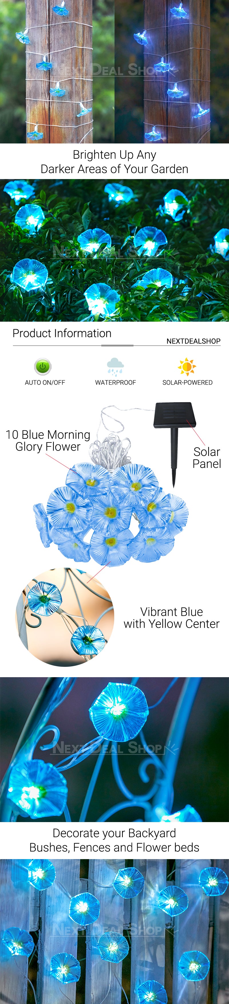 Dekorieren Sie Ihre Hinterhofbüsche, Zäune und Blumenbeete mit diesen atemberaubenden solarbetriebenen Morning Glory Lights. Das leuchtende Blau mit Gelb in der Mitte simuliert das Wachstum einer echten Prunkwinde in Ihrem Garten. Sie sind solarbetrieben und schalten sich daher von selbst ein, wenn die Sonne untergeht!